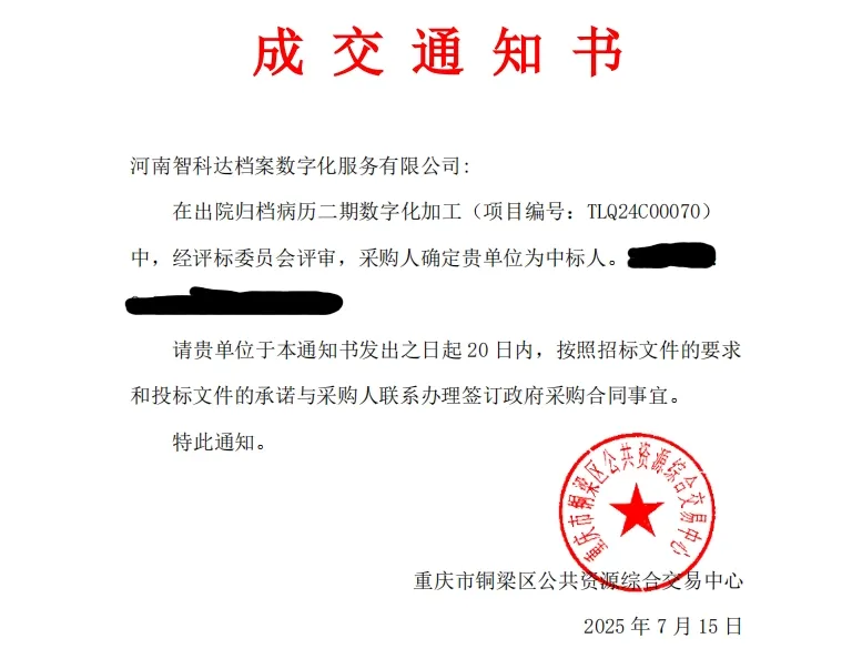 7月15日,智科达中标重庆市铜梁区人民医院的出院归档病历二期数字化加工项目,此次合作不仅引入了新客户,也实现了在西南市场的首次突破。通过数字化转型,不断深耕档案信息服务领域的服务能级,西南市场的成功突破成为智科达档案拓展全国市场的有力支点。